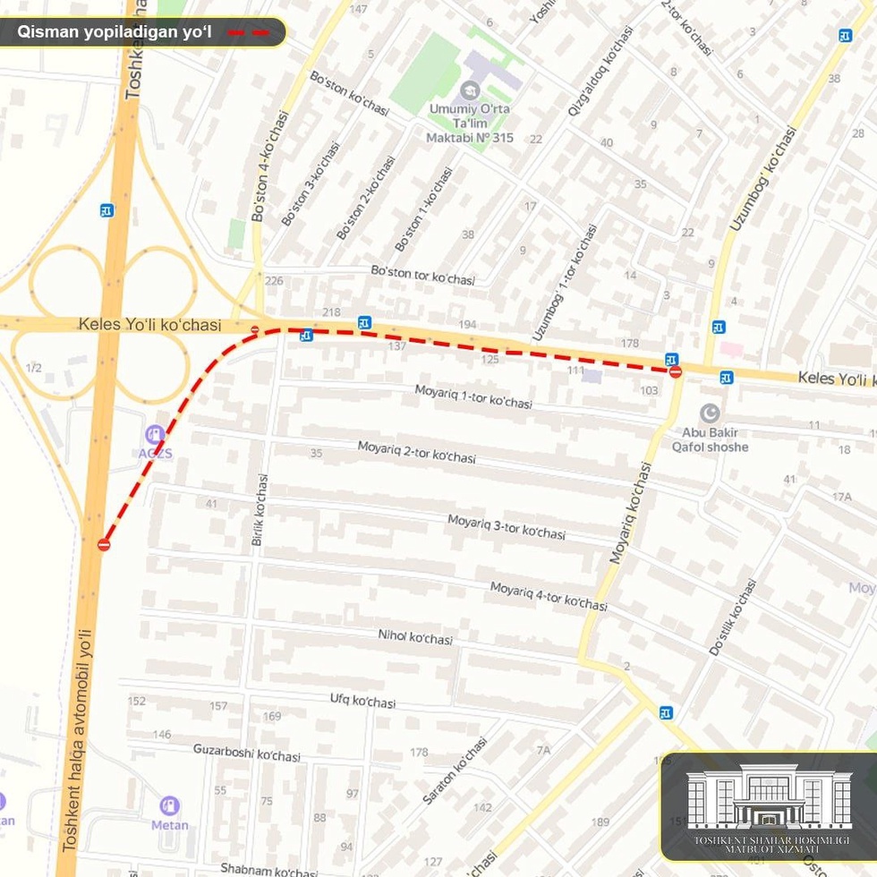 2023-yilning 4-yanvaridan Keles yoʻli koʻchasining Toshkent halqa avtomobil yoʻli koʻprigidan Moyariq koʻchasigacha boʻlgan oraligʻi avtotransport vositalari harakati toʻxtatilmagan holda qisman yopiladi.
