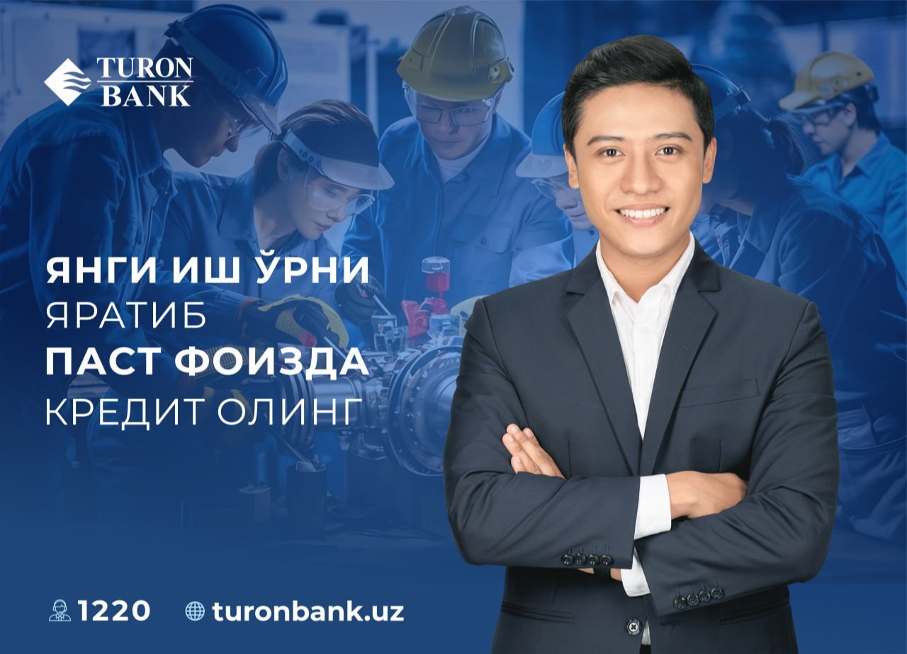 – Assalomu alaykum. Bugungi kunda “Turonbank” aksiyadorlik tijorat banki Prezidentimizning “Kichik biznesni rivojlantirishni moliyaviy va institutsional qoʻllab-quvvatlash chora-tadbirlari toʻgʻrisida”gi qaroriga muvofiq yuridik shaxslarga “Mening biznesim” nomli kredit turini taklif etmoqda. Uning doirasida ishbilarmonlar 100 mln soʻmdan 1,5 mlrd soʻmgacha moliyaviy koʻmak olishlari mumkin. Xususan, kamida bir yil mobaynida faoliyat yuritib kelayotgan yakka tartibdagi tadbirkorlar, dehqon xoʻjaliklari, oʻzini oʻzi band qilgan shaxslar, hunarmandlar, kasanachilar, nodavlat taʼlim tashkilotlari, uch va undan ortiq kishini doimiy ish bilan taʼminlayotgan kichik tadbirkorlik subyektlari, oilaviy tadbirkorlik dasturlari doirasida oʻz biznes loyihalarini muvaffaqiyatli amalga oshirib, ijobiy kredit tarixiga ega boʻlgan yuridik shaxslarga “Turonbank” aksiyadorlik tijorat banki 100 million soʻmgacha garovsiz kredit ajratmoqda. U 24 oygacha boʻlgan imtiyozli davr bilan 84 oygacha rasmiylashtiriladi.