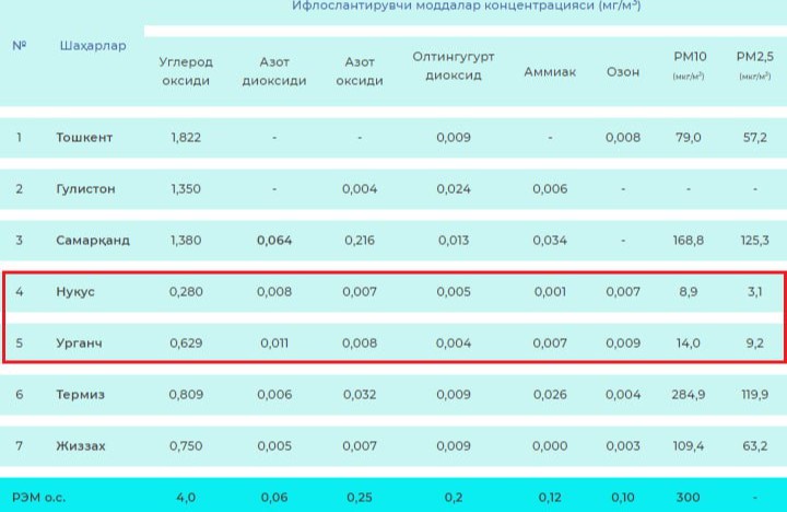 Yuqorida siz respublikaning 7 ta yirik shaharlarida havoni ifloslantirayotgan moddalar miqdoriy koʻrsatkichlari bilan tanishishingiz mumkin.