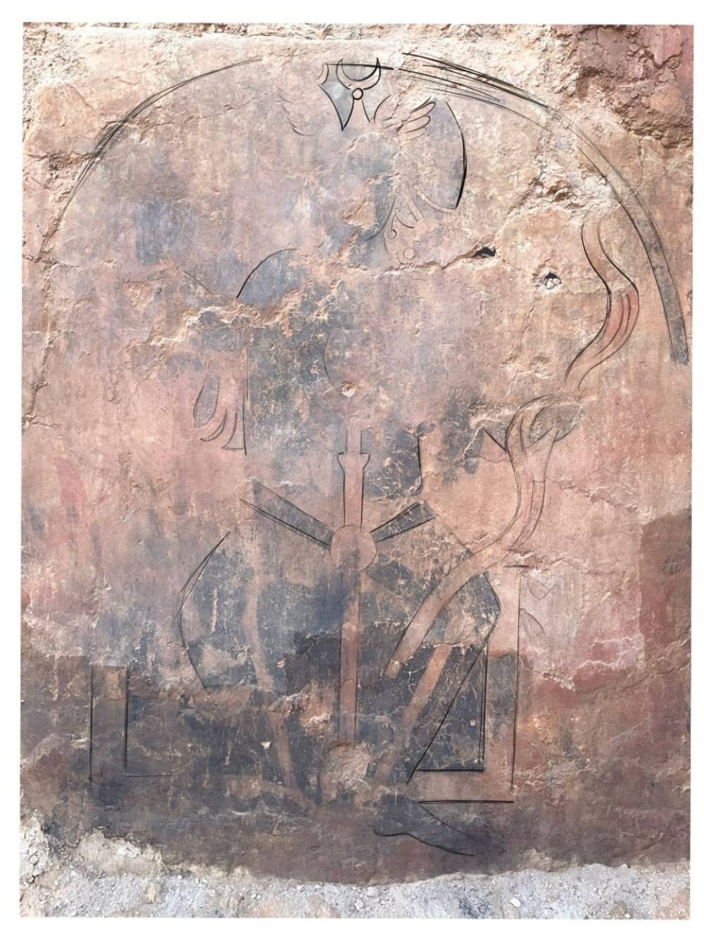 "Ibodatxona devorlarining saqlanib qolgan balandligi 3 metrni tashkil etadi va unda 5 ta eshik mavjud. Devorlarda yuzi ovalsimon va quloqlari zebu-ziynatlarga boy maʼbudaning tasvirlari saqlanib qolgan. Bu tasvirlarda qanotli, ustki qubbasi yarim oy shaklida boʻlgan toj ham koʻzga tashlanadi. Shuningdek, ibodatxona devorlaridagi surat parchalarida turli personaj tasvirlari ham uchraydi, bu esa ibodatxonada bir nechta iloh tasvirlanganini koʻrsatadi.