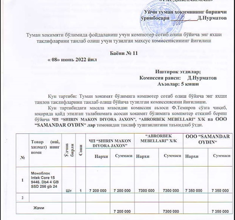 Jumladan, tuman hokimining yuqorida keltirilgan Farmoyishida 121,4 million soʻm mablagʻlar yoshlar yetakchilariga sharoit yaratish maqsadida mebel jihozlari sotib olish uchun ajratilgan boʻlsa-da, birgina holatda 7,2 million soʻmga kompyuter vositasi sotib olingan.