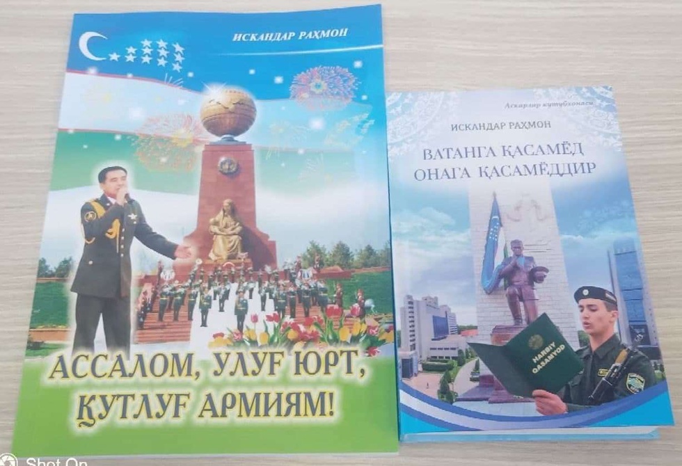 Shu ezgu maqsadlar yo'lida harbiy shifokor va ijodkor Iskandar Rahmonning Vatanga qasamyod onaga qasamyoddir deb nomlangan she'rlar kitobi hamda Assalom, ulug' yurt, qutlug' armiyam! deb nomlangan harbiyona taronalar va saf qo'shiqlar to'plami chop etildi.