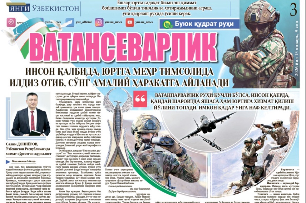 Sir emas, biz vatanparvarlik tuygʻusi jiddiy sinovdan oʻtayotgan davrda yashayapmiz. Hozir turli ziddiyatlar kengayib, umuminsoniy qadriyatlarga hurmat, xalqaro huquq normalari va diplomatiya zaiflashib bormoqda. Qolaversa, mamlakatlarga hujum shakllari ham tubdan oʻzgardi. Buni davlatimiz rahbari ham taʼkidlab, shunday dedi: “Bir narsani tushunib olish zarur. Zamonaviy urush tabiati tubdan oʻzgardi. Endi qaysi davlat faqat tank, samolyot yoki askarlar soniga tayanib gʻalaba qozonaman desa, qattiq adashadi. Hozirgi janglar sunʼiy intellekt, raqamli boshqaruv, uzoq masofaga yuqori aniqlikda zarba beruvchi vositalar, kiber va robot texnologiyalar, siyosiy-iqtisodiy bosim asosida olib borilmoqda”.