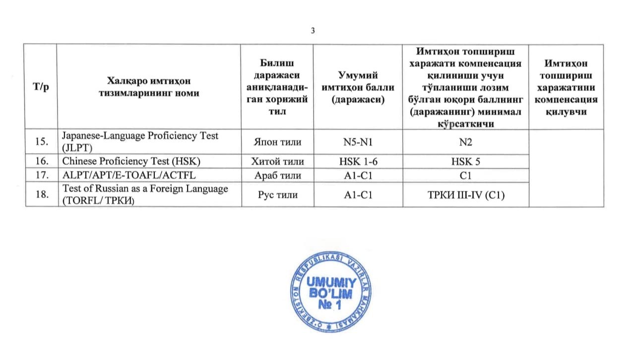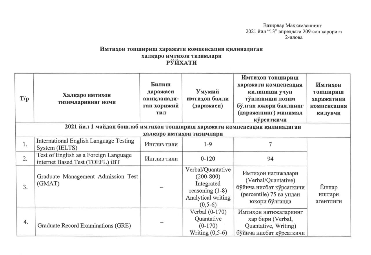Xalqaro imtihon tizimlarining roʻyxati va minimal ball (daraja) miqdori yuqoridagi ilovada berilgan.