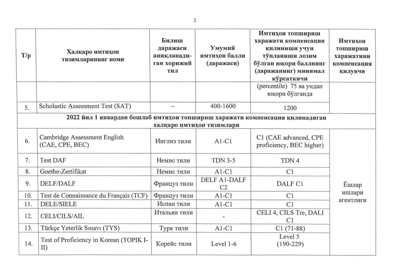 5 ta xalqaro imtihon tizimi (IELTS, TOEFL, GMAT, GRE, SAT) boʻyicha kompensatsiyalar 2021-yil 1-maydan boshlab toʻlanadi, yana 13 ta imtihon tizimi boʻyicha xarajatlar 2022-yil 1-yanvardan qoplanishni boshlaydi.