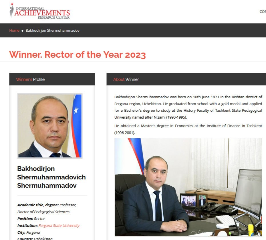 Quvonarlisi, dunyoning eng nufuzli xalqaro ekspertlari va “IARC” Hakamlar qoʻmitasi xulosasiga koʻra, Fargʻona davlat universiteti rektori, professor - Bahodirjon Shermuhammadov boshqaruvga innovatsion yondashuv, sifatli taʼlim va zamonaviy taʼlim texnologiyalarining joriy etilishi, ilmiy-tadqiqot faoliyatini takomillashtirilishi, universitetning oʻquv-texnologik jihozlari sifat darajasi, talabalarning ijodiy va sport sohasidagi yuqori salohiyati, jamoada korporativ madaniyatni shakllantirilishi boʻyicha - Xalqaro Yutuqlar Tadqiqot Markazining (IARC “Yil rektori – 2023” tanlovi reytingda yuqori koʻrsatkichlar bilan gʻolib deb topildi.