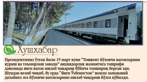 Prezidentimiz oʻtgan yili 19-mart kuni “Toshkent yoʻlovchi vagonlarini qurish va taʼmirlash zavodi” aksiyadorlik jamiyatiga tashrifi davomida yangi vagon ishlab chiqarish boʻyicha topshiriq bergan edi.