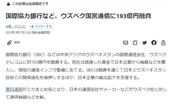“Yaponiya xalqaro hamkorlik banki (JBIC) va «Mitsubishi UFJ” banki «Oʻzbektelekom» AKga qariyb 19,3 milliard iyen (150 million AQSH dollari) miqdorida moliyaviy yordam koʻrsatadi, - deb yozadi gazeta. - Mablagʻlar Oʻzbekistonda axborot-kommunikatsiya infratuzilmasini rivojlantirish uchun yapon uskunalarini xarid qilishga yoʻnaltiriladi.