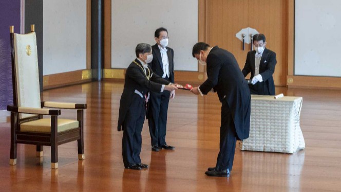 Anʼanaga koʻra, ordenni Yaponiya imperatori Naruxito Bosh vazir Fumio Kishido ishtirokida topshirdi.