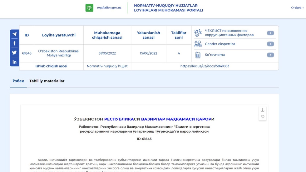 Mazkur qaror loyihasi bilan 2022-yil 1-iyuldan boshlab: