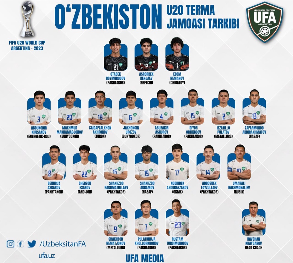 Futbol boʻyicha Oʻzbekiston yoshlar terma jamoasi bosh murabbiyi Ravshan Haydarov U-20 jahon chempionatida ishtirok etadigan futbolchilarning yakuniy roʻyxatini eʼlon qildi.