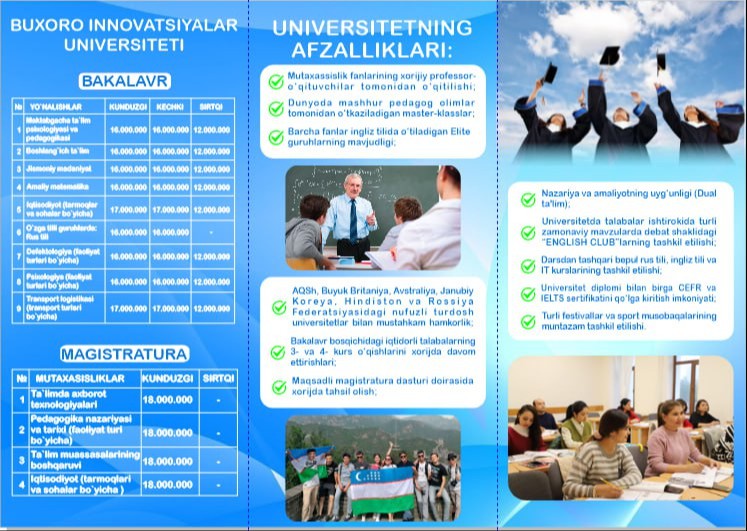 Buxoro innovatsiyalar universiteti tashkil etilishi ham ana shu islohotlar samarasi, deb ayta olamiz. Tashkil etilganiga hali bir yil boʻlmasa-da, oliy taʼlim muassasamiz qisqa muddatda yutuqlarga erisha boshladi. Zamonaviy kompyuterlar, bir yarim million kitob fondiga ega elektron kutubxona, 15 mingga yaqin oʻquv va badiiy adabiyot jamlangan axborot-resurs markazi, televizorlar, elektron doskalar, zamonaviy mebellar, kovorking markaz, sport zallari, yotoqxonalar mavjud universitetimizda toʻqqizta bakalavriat yoʻnalishi va toʻrtta magistratura yoʻnalishida taʼlim berilmoqda.