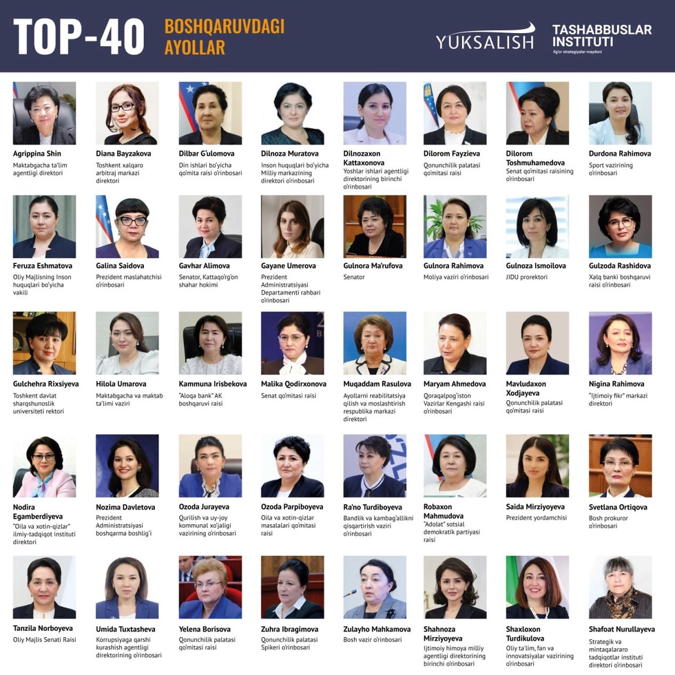 Natijada bugun siyosiy, ijtimoiy-iqtisodiy tarmoqlar rivojiga salmoqli hissa qoʻshayotgan, sohalarda muhim vazifalarni bajarib kelayotgan 40 nafar rahbar ayollarning yillik reytingi tuzildi.