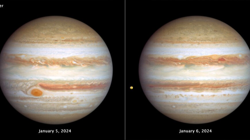 Olimlar Yupiterda ko'plab yirik bo'ronlar va mayda oq bulutlar belgilarini ham aniqlashdi. Tasvirlar shuningdek, sayyoraning tabiiy yo'ldoshi Ioni ham o'z ichiga oladi. Bu butun Quyosh tizimidagi eng faol vulqonlarga ega osmon jismdir, deb xabar beradi mir24.tv.