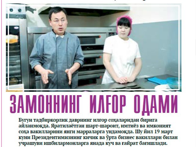 — Uchrashuv biz, tadbirkorlar faoliyatida yangi bosqich boshlanayotgani, soha davlatimiz rahbarining doimiy eʼtiborida ekanini anglatadi, — deydi Nukus shahridagi “Visconti” korxonasi rahbari Miyrigul Kaipova. — Men ham tadbirkorligimni ana shu imkoniyatlar asosida, yaʼni 100 million soʻm imtiyozli kredit olib, non va non mahsulotlarini ishlab chiqarishdan boshlaganman. Shunga ham bir yil boʻldi. Ayni paytda korxonamizda mehnat qilayotgan 6 nafar xotin-qiz bilan birga aholi dasturxoniga 46 turdagi non va non mahsulotlarini yetkazib beryapmiz.