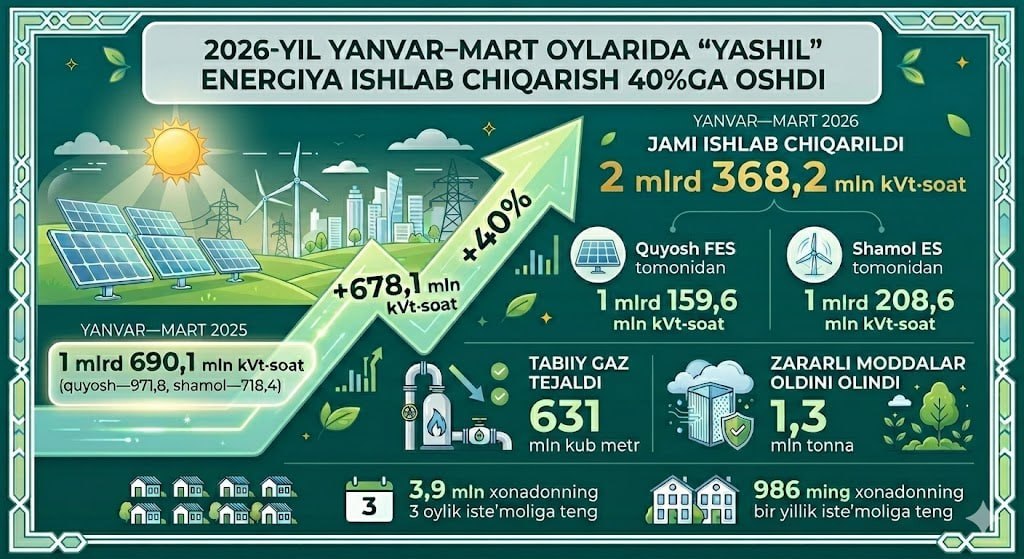 Taqqoslash uchun, 2025 yilning shu davrida quyosh va shamol stansiyalari 1 mlrd 690,1 mln kVt⋅soat elektr energiyasi ishlab chiqargan edi.